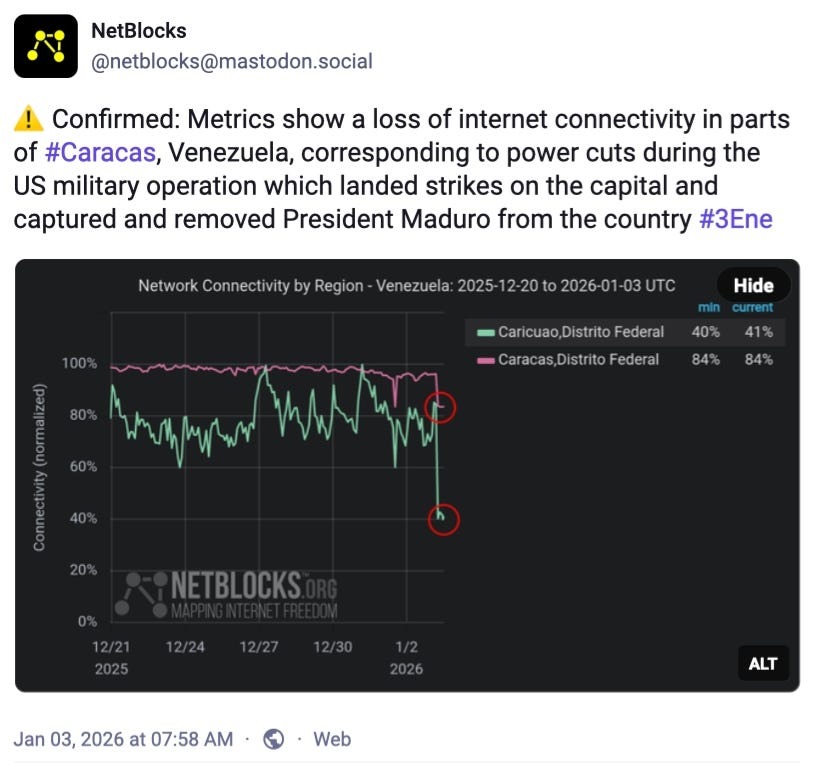 Venezuela experienced significant network degradation on Jan. 3, but experts stress that such outages could just as easily result from electronic warfare or conventional attacks.