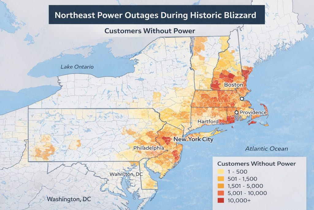 Air travel was severely disrupted, with over 10,000 flights canceled nationwide—many centered around Boston Logan International Airport and major New York-area airports. Meanwhile, widespread power outages affected hundreds of thousands of residents, peaking at around 650,000 before gradually declining, though many were still without electricity into Tuesday.